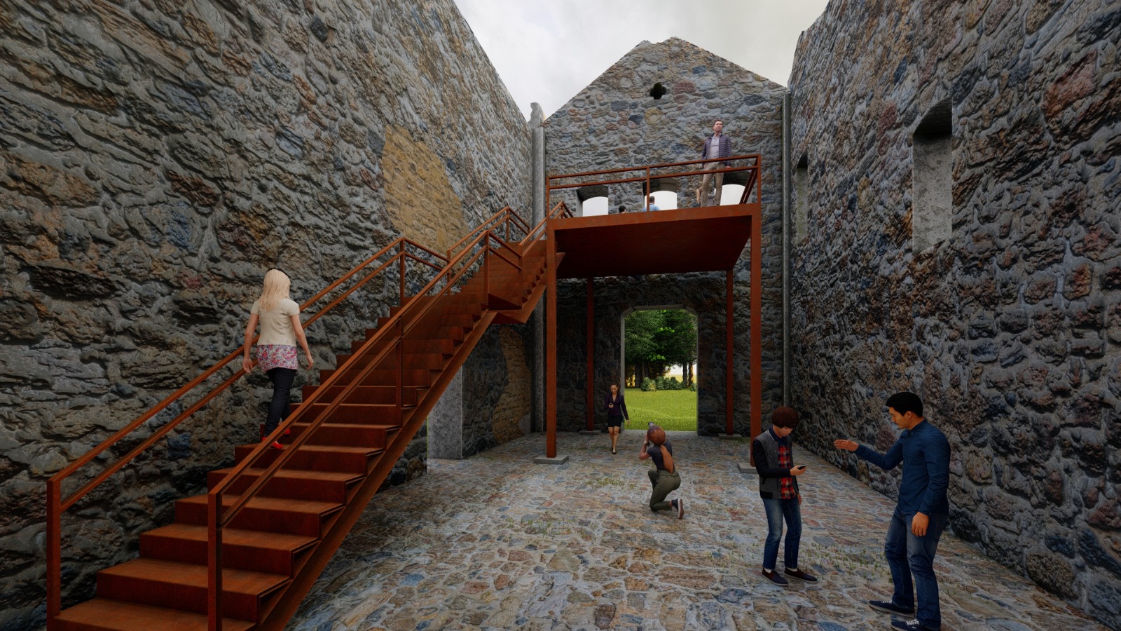 O mirante segue como uma das principais propostas do projeto. “Um novo nível dentro da ruína, em estrutura metálica, sustentado por quatro pilares com sapatas isoladas e acessado por uma escada independente”, explica a arquiteta. “Esse mezanino, concebido como uma estrutura autoportante que não toca as paredes existentes, reinterpreta o antigo coro da capela, oferecendo aos visitantes uma nova perspectiva do espaço”, acrescenta Jessica ao destacar que, deste modo, a nova estrutura não se impõe sobre a ruína. “Ela se deixa descobrir”, arremata.