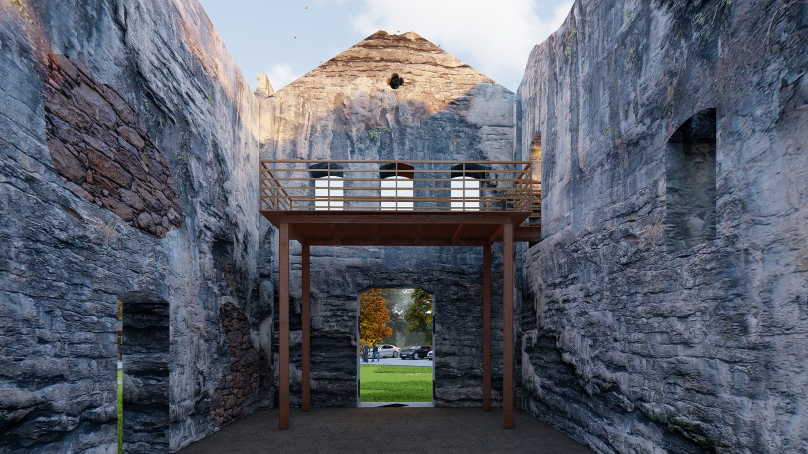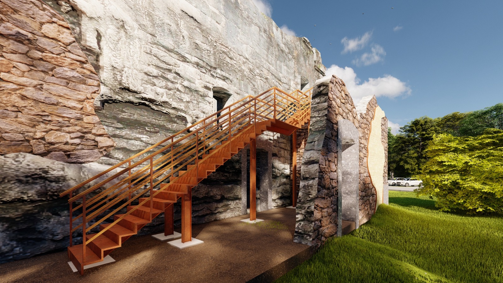 Com essa nova compreensão, a equipe reavaliou o projeto. Foi constatado que a escada que seria originalmente posicionada na nave principal ocuparia um espaço significativo e geraria uma assimetria que comprometia a leitura da ruína. A decisão, portanto, foi reposicionar a escada para a nave lateral, liberando o espaço central para contemplação e preservando a percepção do conjunto histórico.